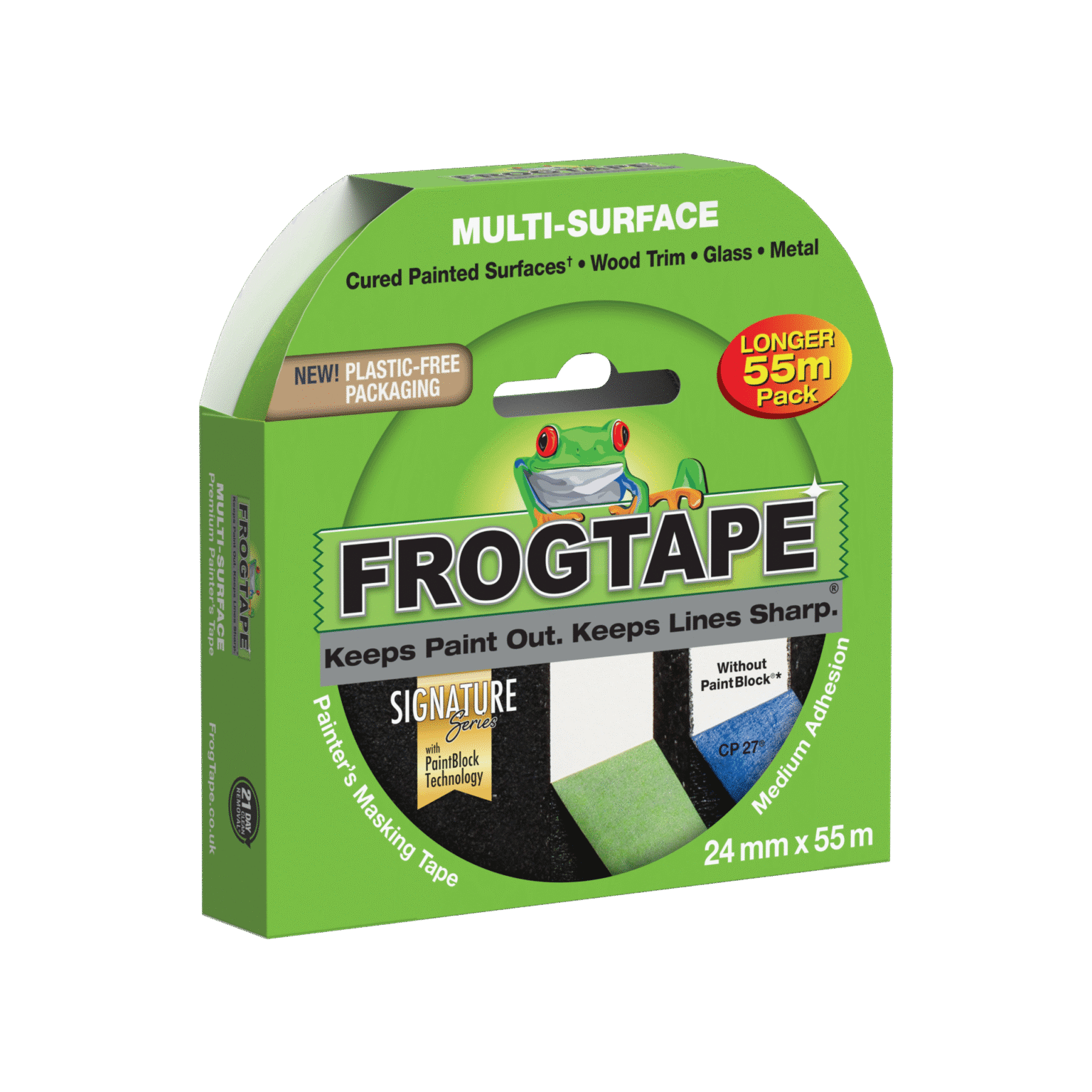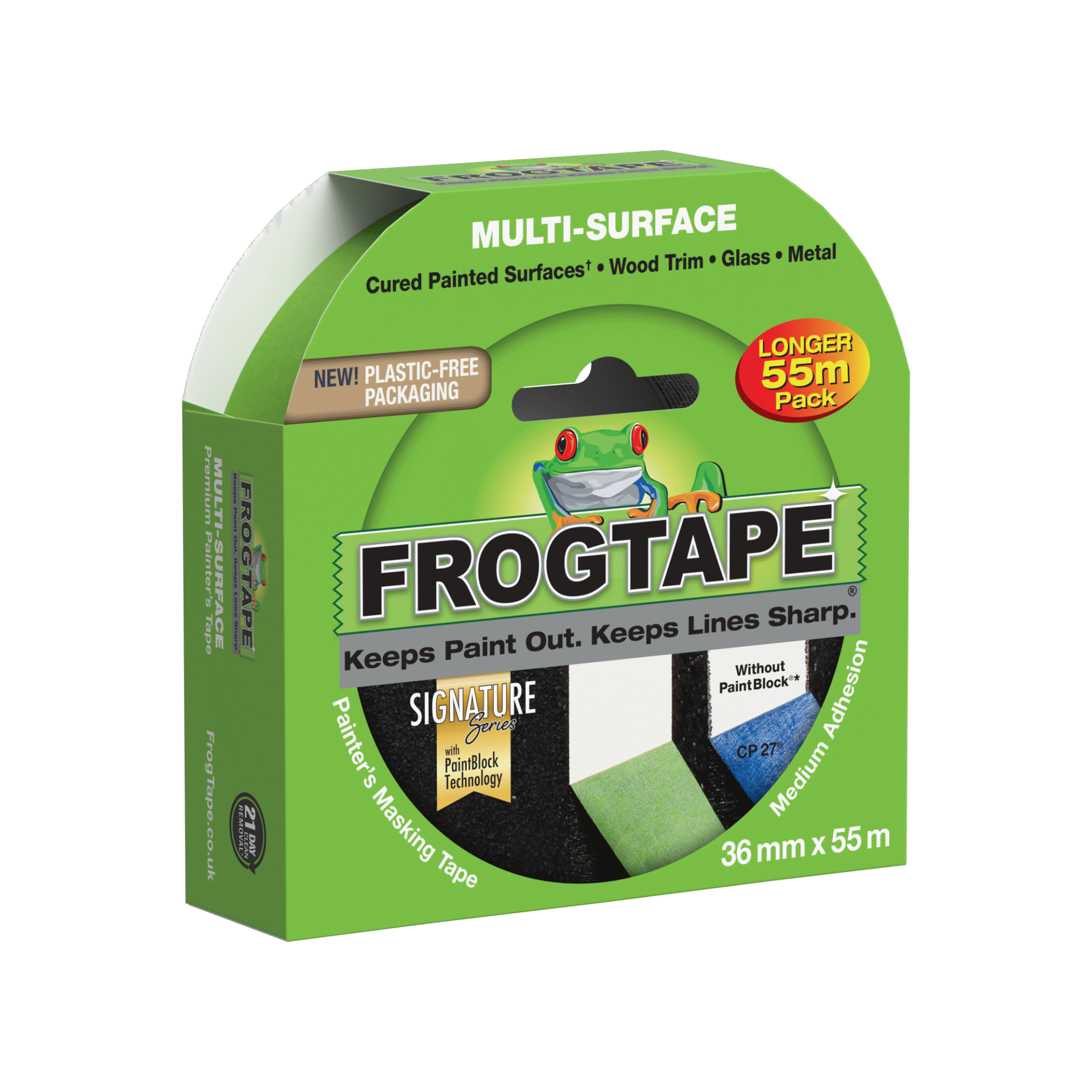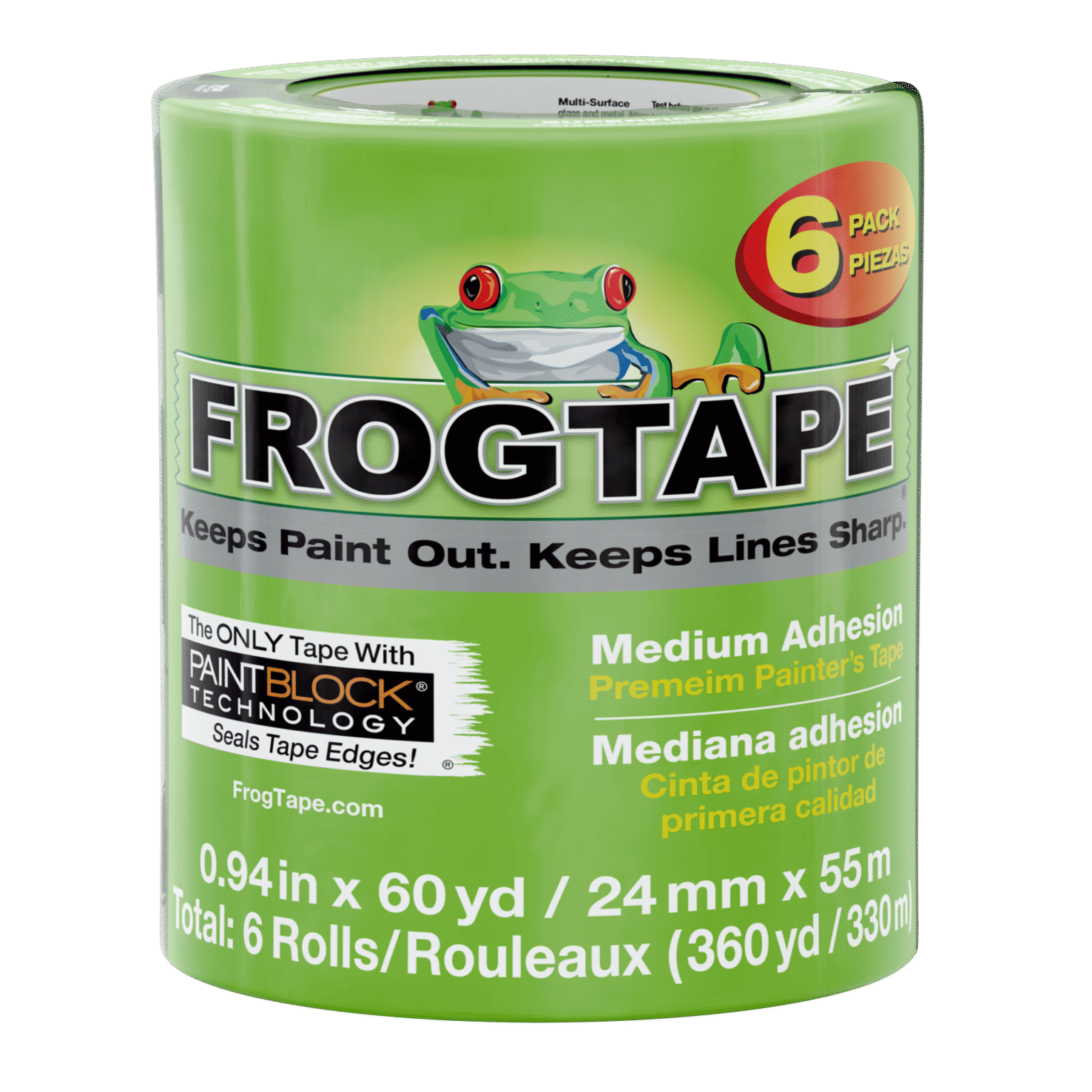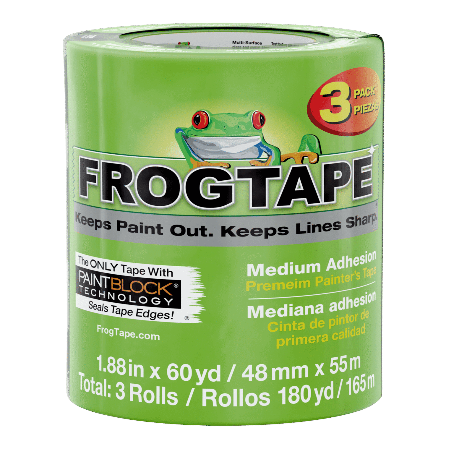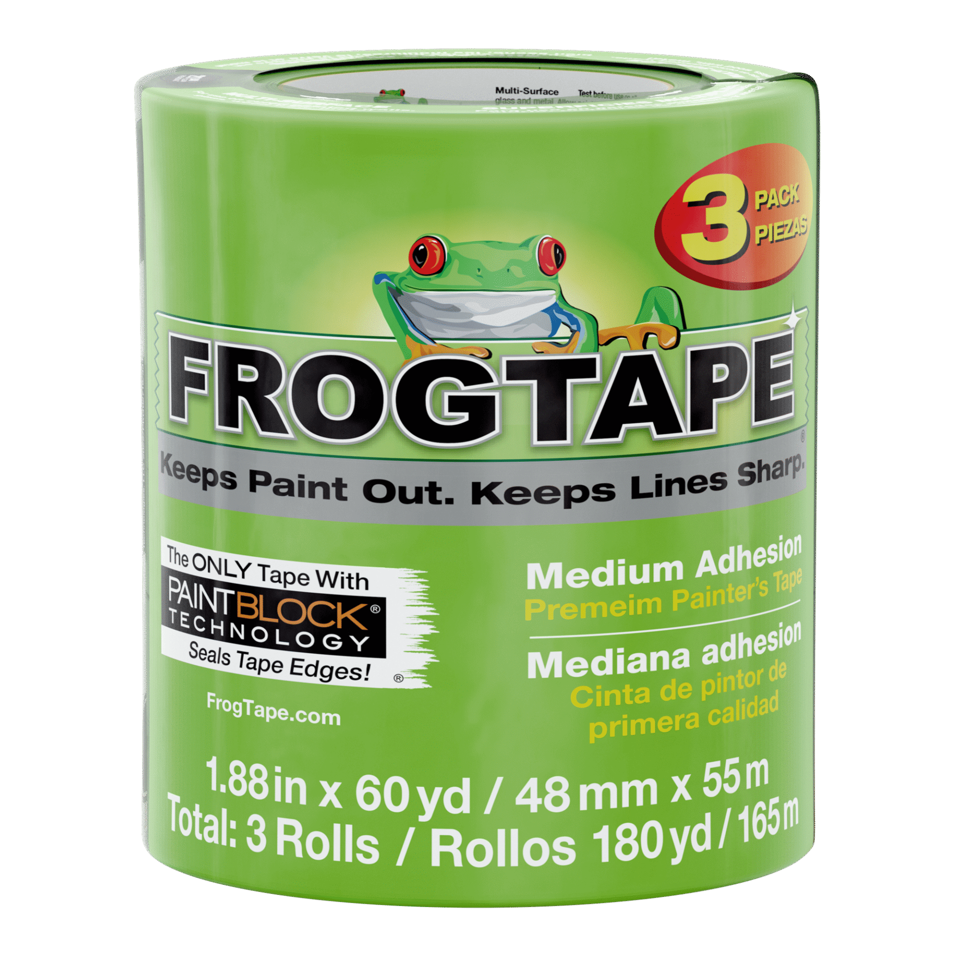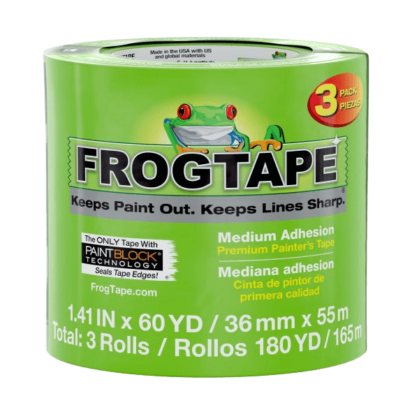 FrogTape® Multi-Surface is a premium, medium adhesion painter’s masking tape that helps you achieve crisp, clean paint lines and saves time and money by eliminating the need for touch-ups.